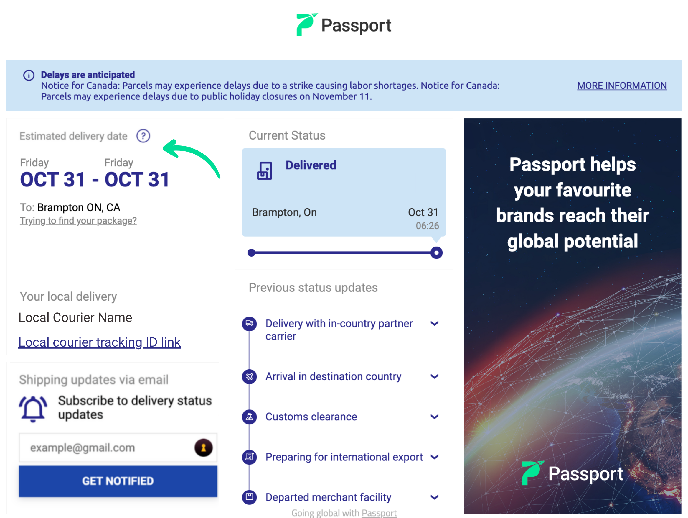 The merchant may show an estimated timeline at checkout, but your Passport tracking page always has the most current information based on your package's actual progress.
