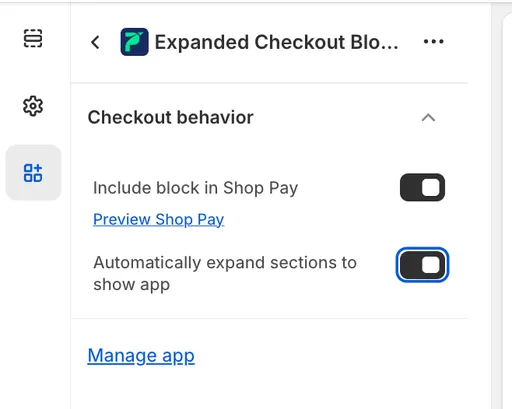 2. Enable “Include block in Shop Pay” and “Automatically expand section to show app” and hit “Save”